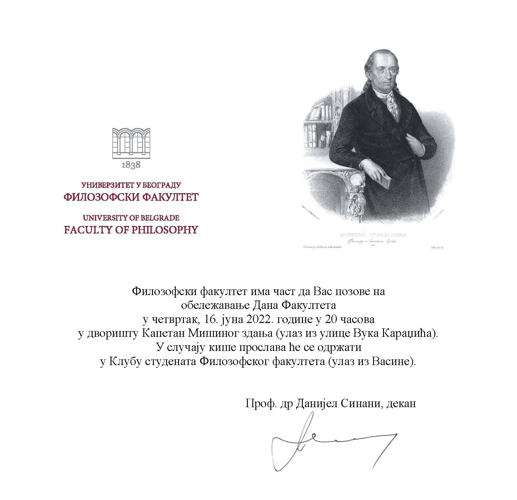 Обавештавамо вас да ће се прослава Дана Филозофског факултета ове године обележити доделом награда студентима генерације десет студијских група у уторак 15. јуна.