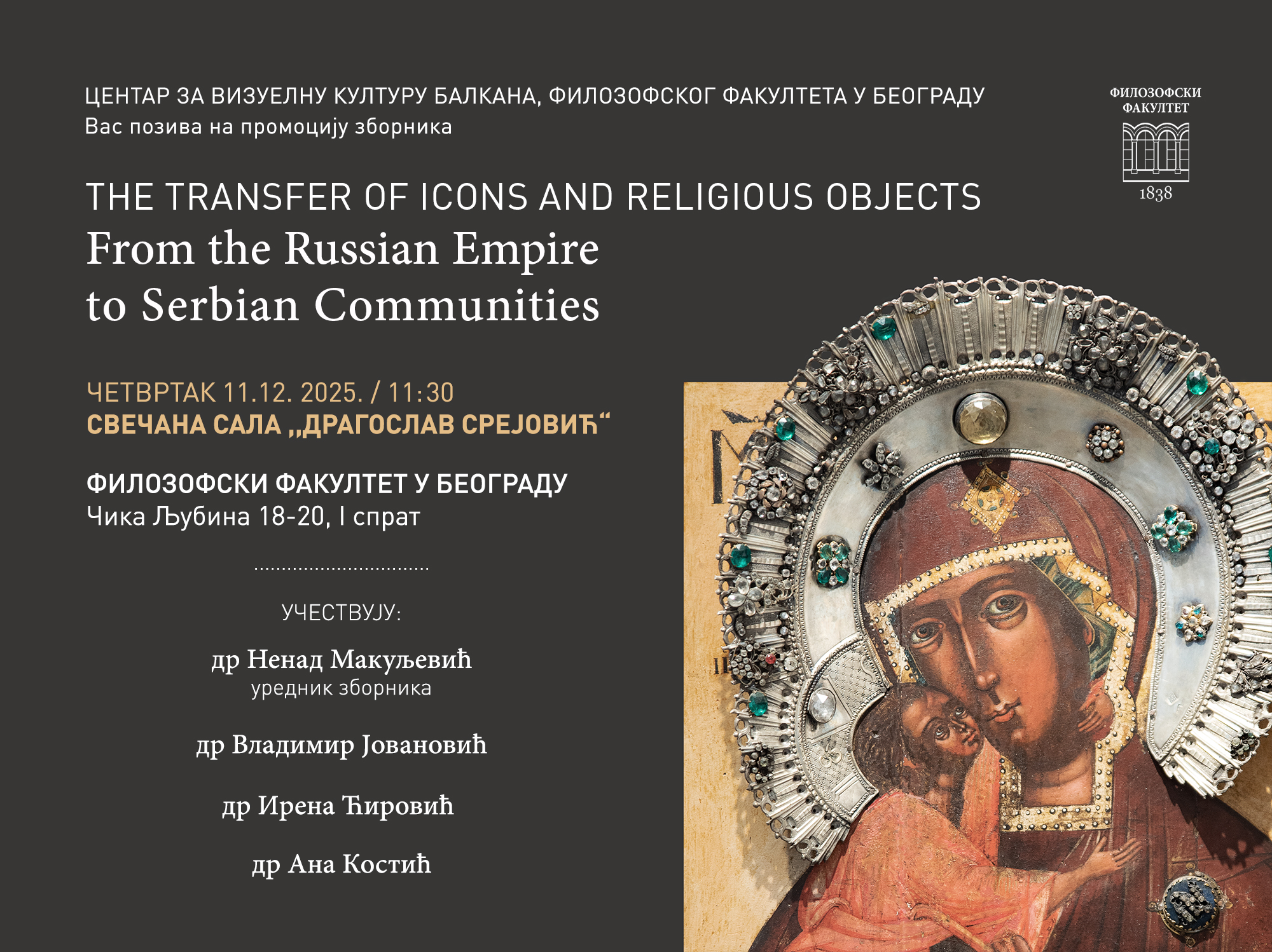 Промоција зборника THE TRANSFER OF ICONS AND RELIGIOUS OBJECTS: From the Rusian Empire to Serbian Communities, 11.12.2025, свечана сала "Драгослав Срејовић"