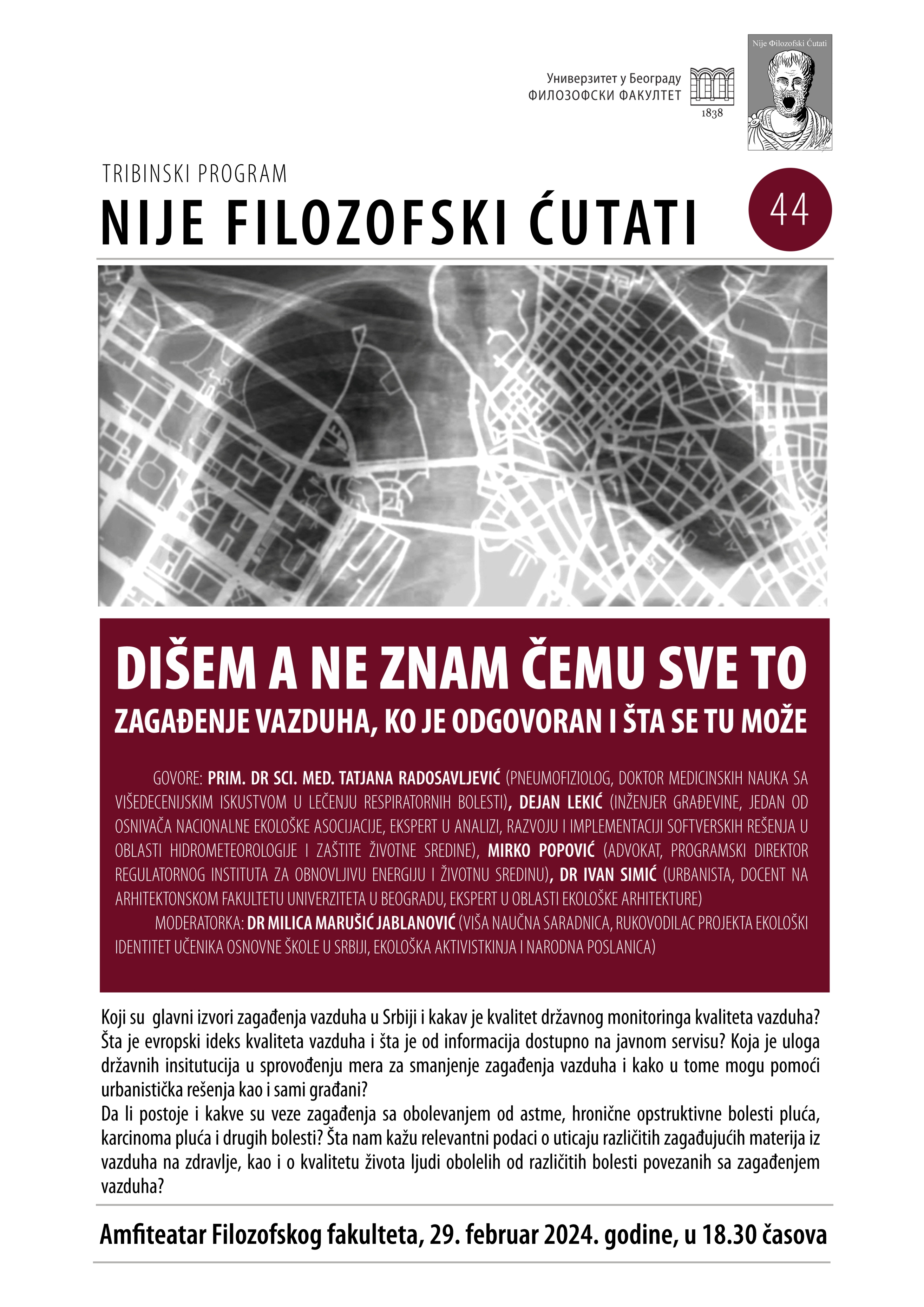 Четрдесет четврта трибина у оквиру циклуса Није Филозофски ћутати, ДИШЕМ А НЕ ЗНАМ ЧЕМУ СВЕ ТО - загађење ваздуха, ко је одговоран и шта се ту може, одржаће се на Филозофском факултету Универзитета у Београду 29.2.2024. године од 18:30 часова.