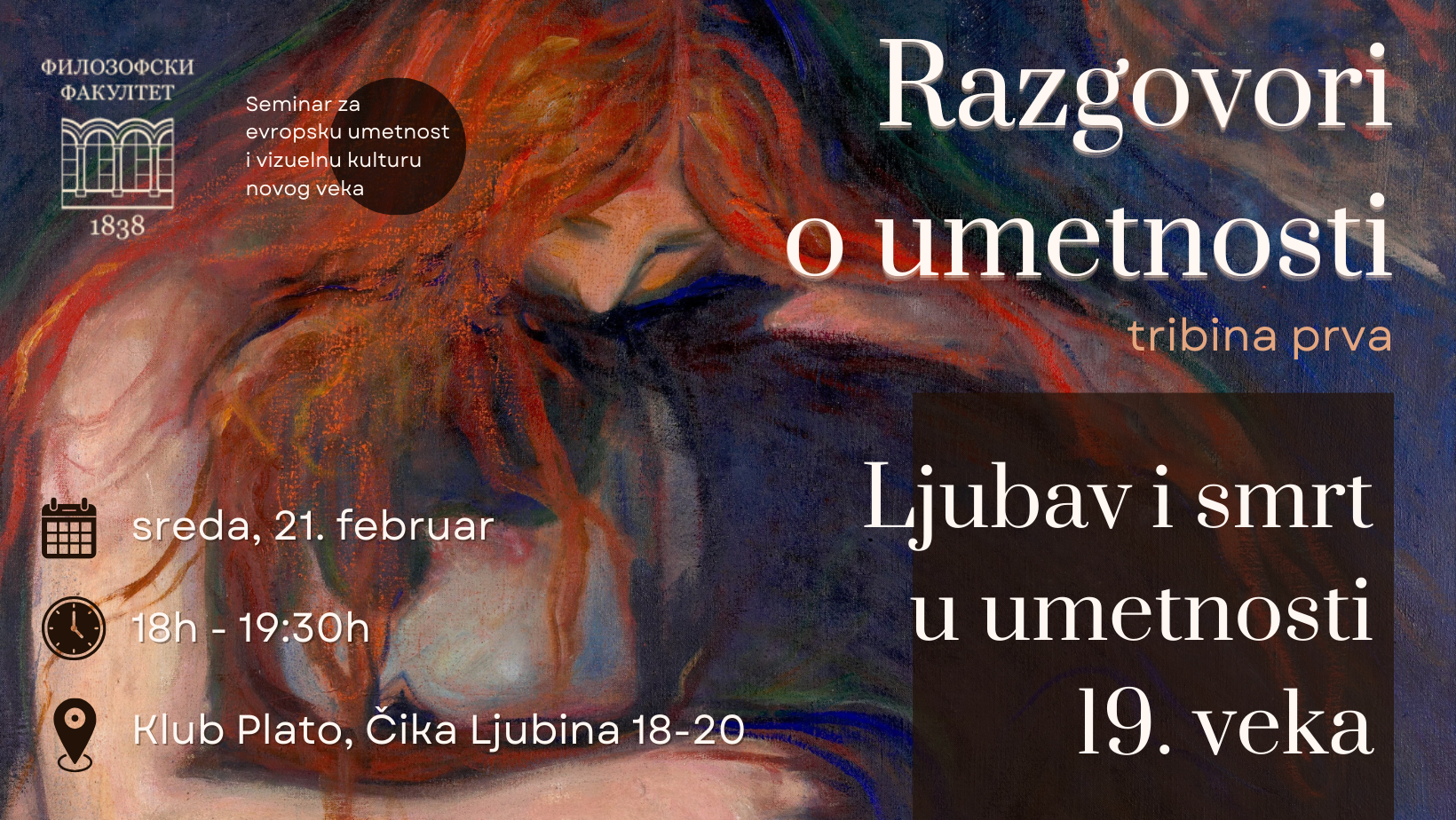 Позивамо вас на прву трибину програма Разговори о уметности коју организују истраживачи Семинара за европску уметност и визуелну културу новог века. Трибина ће се одржати 21. фебруара у 18 часова у клубу Плато (Чика Љубина