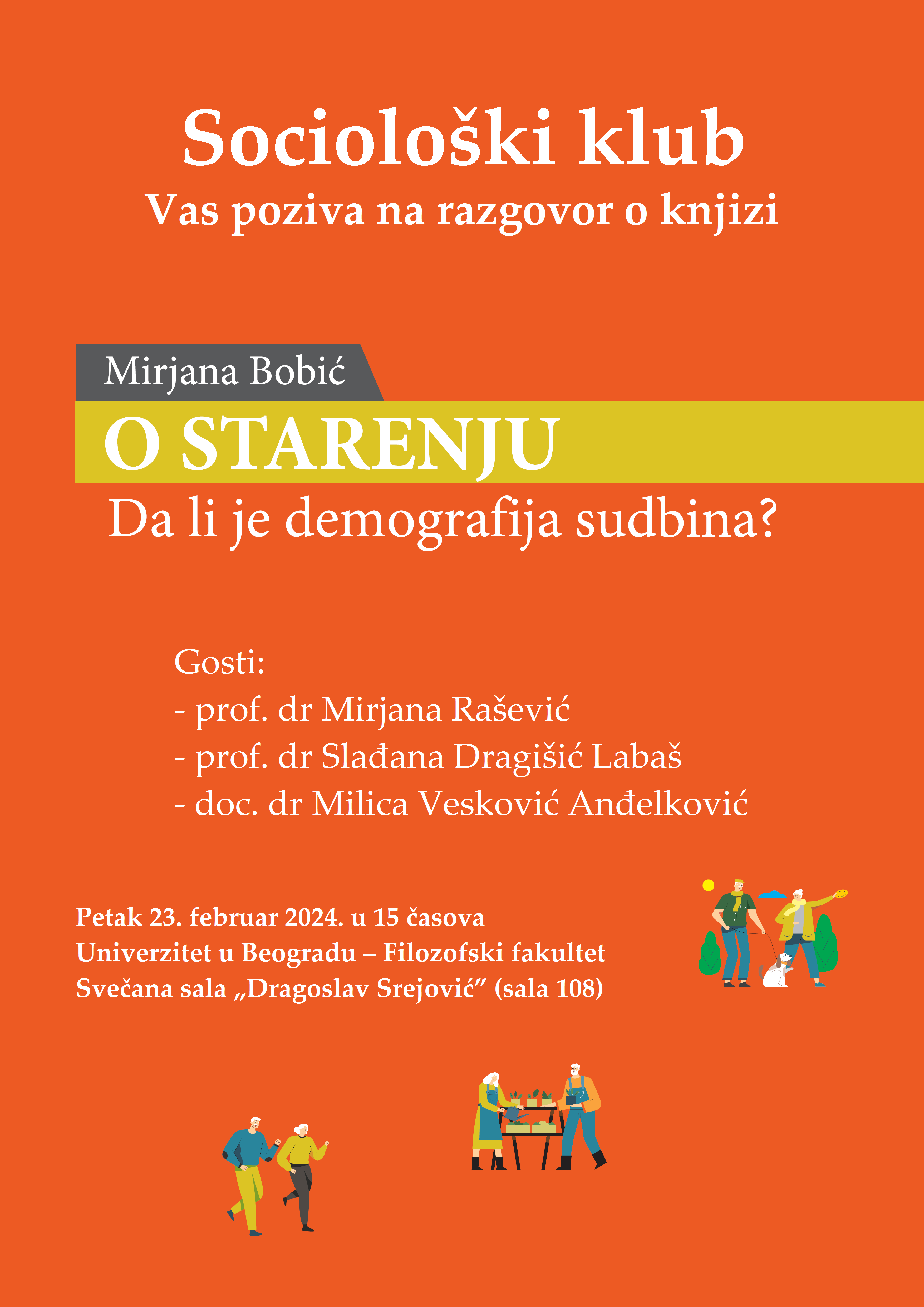 Социолошки клуб вас позива на разговор о књизи О старењу: да ли је демографија судбина? проф. др Мирјане Бобић са Одељења за социологију Филозофског факултета Универзитета у Београду. О књизи ће говорити проф. др Мирјана Рашевић, проф. др Слађана Драгишић Лабаш, доц. др Милица Весковић Анђелковић и ауторка. Разговор ће модерирати Андрија Голубовић.