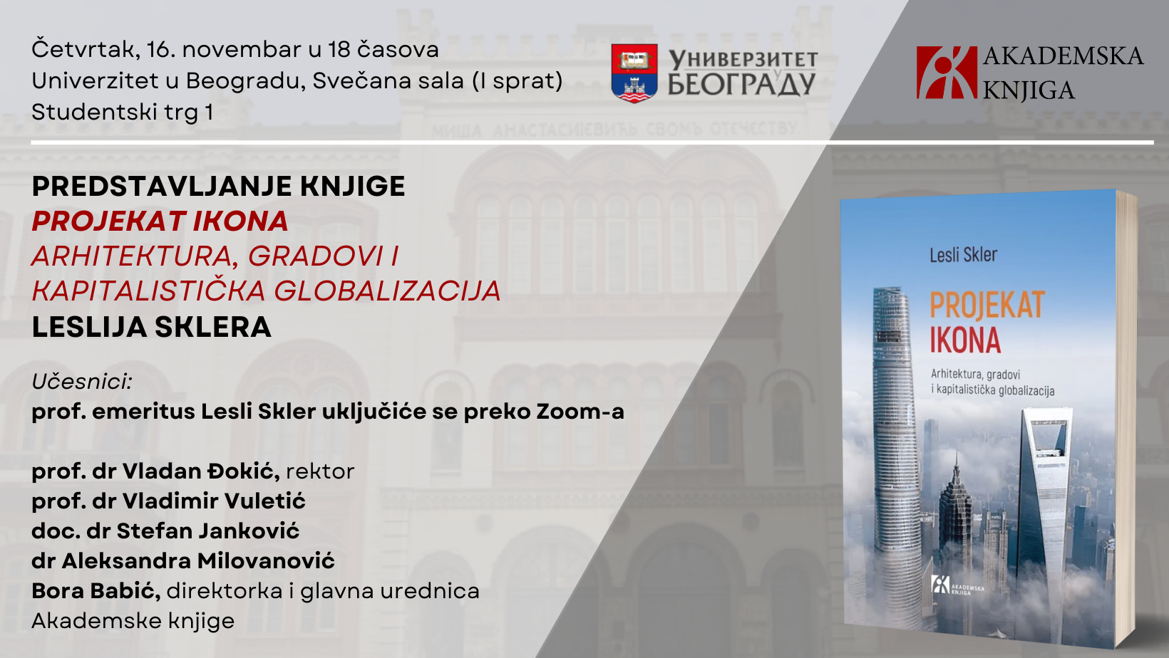 Позивамо вас на промоцију књиге Леслија Склера „Архитектура икона и капиталистичка глобализација“, у четвртак 16. новембра, у 18:00h, Универзитет у Београду, Свечана сала (1. спрат), Студентски трг 1.