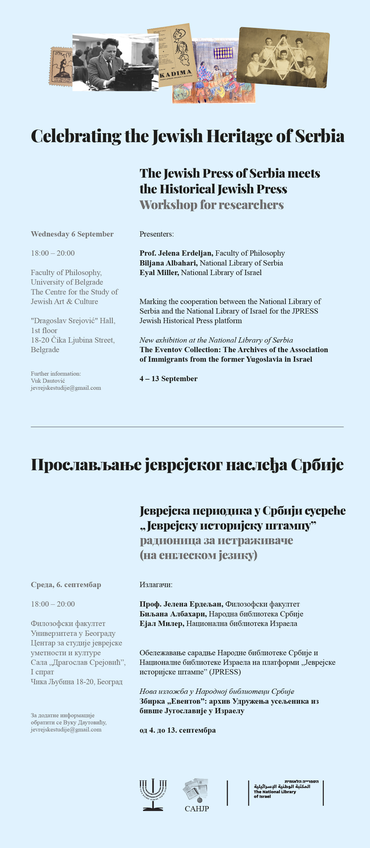 Позива све студенте и колеге на радионицу за истраживаче (на енглеском језику), под називом: Прослављање јеврејског наслеђа Србије: Јеврејска периодика у Србији сусреће „Јеврејску историјску штампу”, у Средау 6. септембра 2023. године од 18:00 до 20:00 часова. Радионица ће се одржати у свечаној сали „Драгослав Срејовић”, на I спрату, Филозофског факултета.
