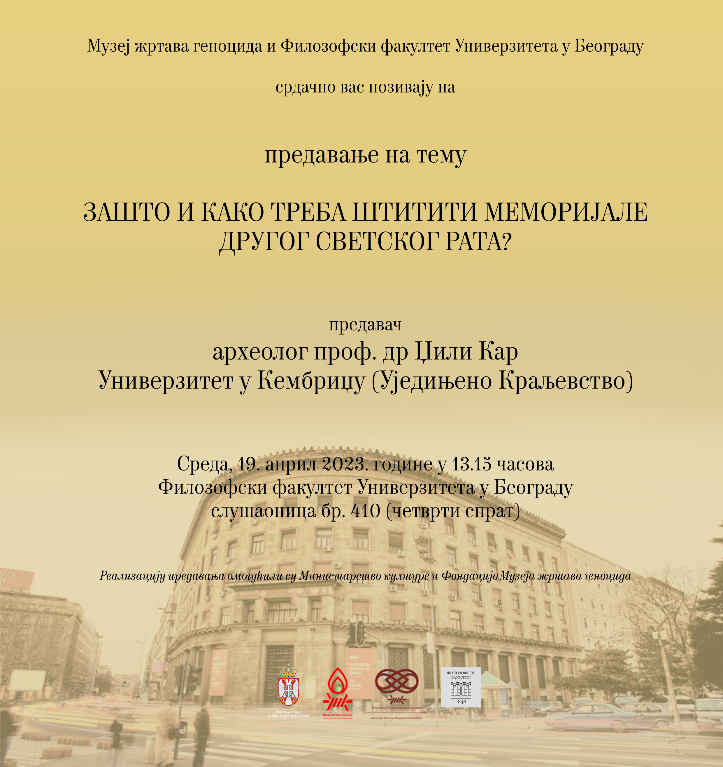Обавештавамо вас да ће у среду 19. априла у 13,15 часова у сали 410 бити одржанo предавање проф. др Џили Кар (Gilly Carr) са Универзитета у Кембриџу поводом обележавања Музеја жртава геноцида и националног Дана сећања на жртве Холокауста, геноцида и друге жртве фашизма у Другом светском рату. Проф. Кар се бави археологијом и заштитом меморијалних споменика из Другог светског рата.