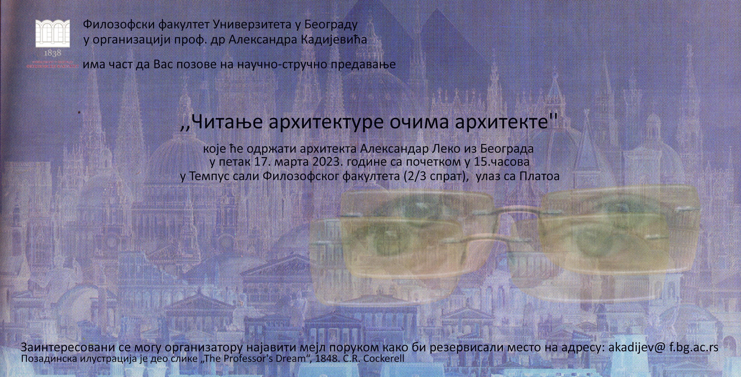 Позивамо студeнте и наставнике Филозофског факултета да присуствују предавању арх. Александра Лека "Читање архитектуре очима архитекте," које ће се одржати 17.3.2023.године од 15.чaсова у Темпус сали Филозофског факултета (међуспрат 2/3) у старој згради.
