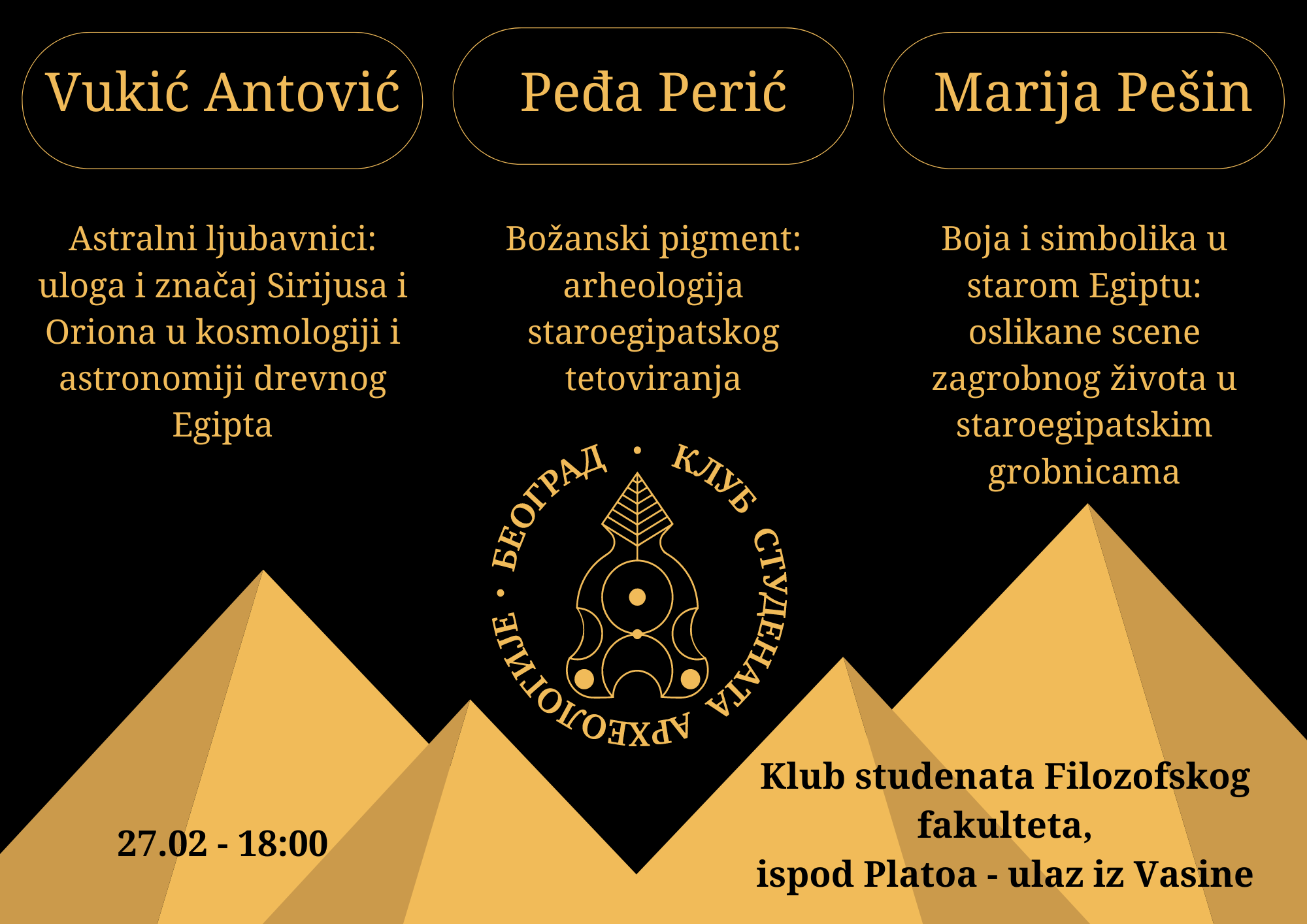 Клуб студената археологије враћа на сцену студентске конференције, те стога имамо задовољство да вас позовемо на VIII конференцију студената археологије! Како је циљ наших конференција да у пријатељском студентском окружењу радимо на ширењу знања и вежбању јавног наступа, да се дружимо и упознајемо, позивамо вас да нам се придружите 27. фебруара од 18 часова. Очекује нас мало тематско вече где ћемо имати прилику да чујемо три теме које покривају различите аспекте културе старог Египта.