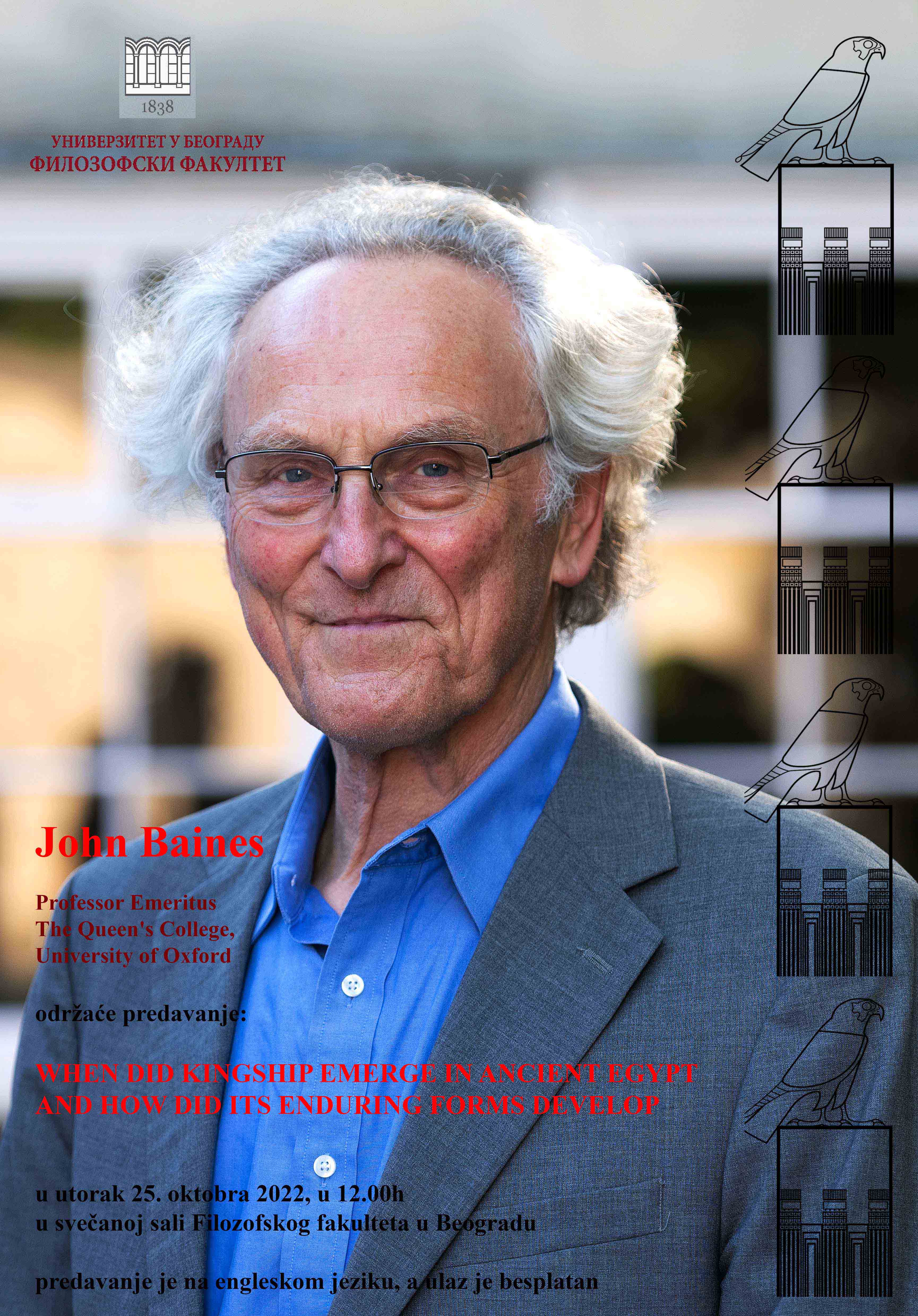 Professor Emeritus John Baines, The Queen’s College, University of Oxford, одржаће предавање: WHEN DID KINGSHIP EMERGE IN ANCIENT EGYPT AND HOW DID ITS ENDURING FORMS DEVELOP, у уторак 25. октобра 2022, у 12.00h, у свечаној сали Филозофског факултета у Београду. Предавање је на енглеском језику, а улаз је бесплатан.