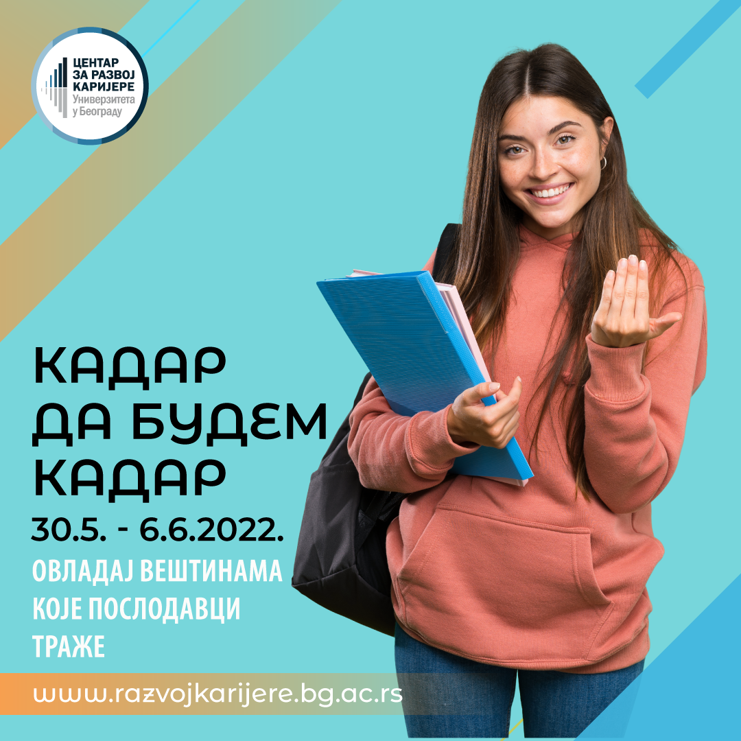 Универзитет у Београду - Центар за развој каријере и саветовање студената и ове године организује програм КАДАР ДА БУДЕМ КАДАР, који ће се реализовати у периоду од 30. маја до 6. јуна 2022. године, а намењен је студентима завршних година.