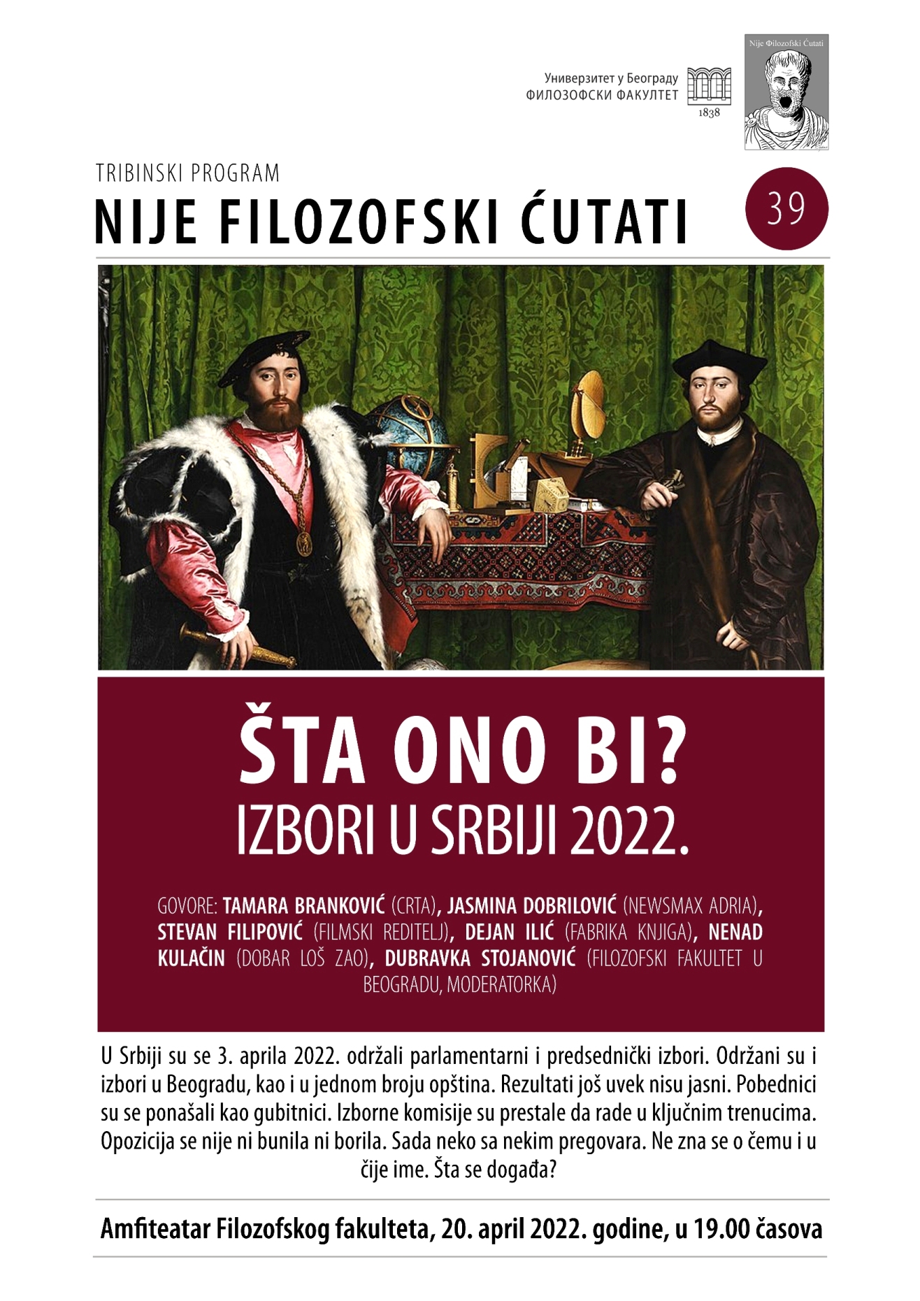 У оквиру циклуса Није Филозофски ћутати на Филозофском факултету у Београду у среду 20.4.2022. одржаће се трибина ” ШТА ОНО БИ?”.