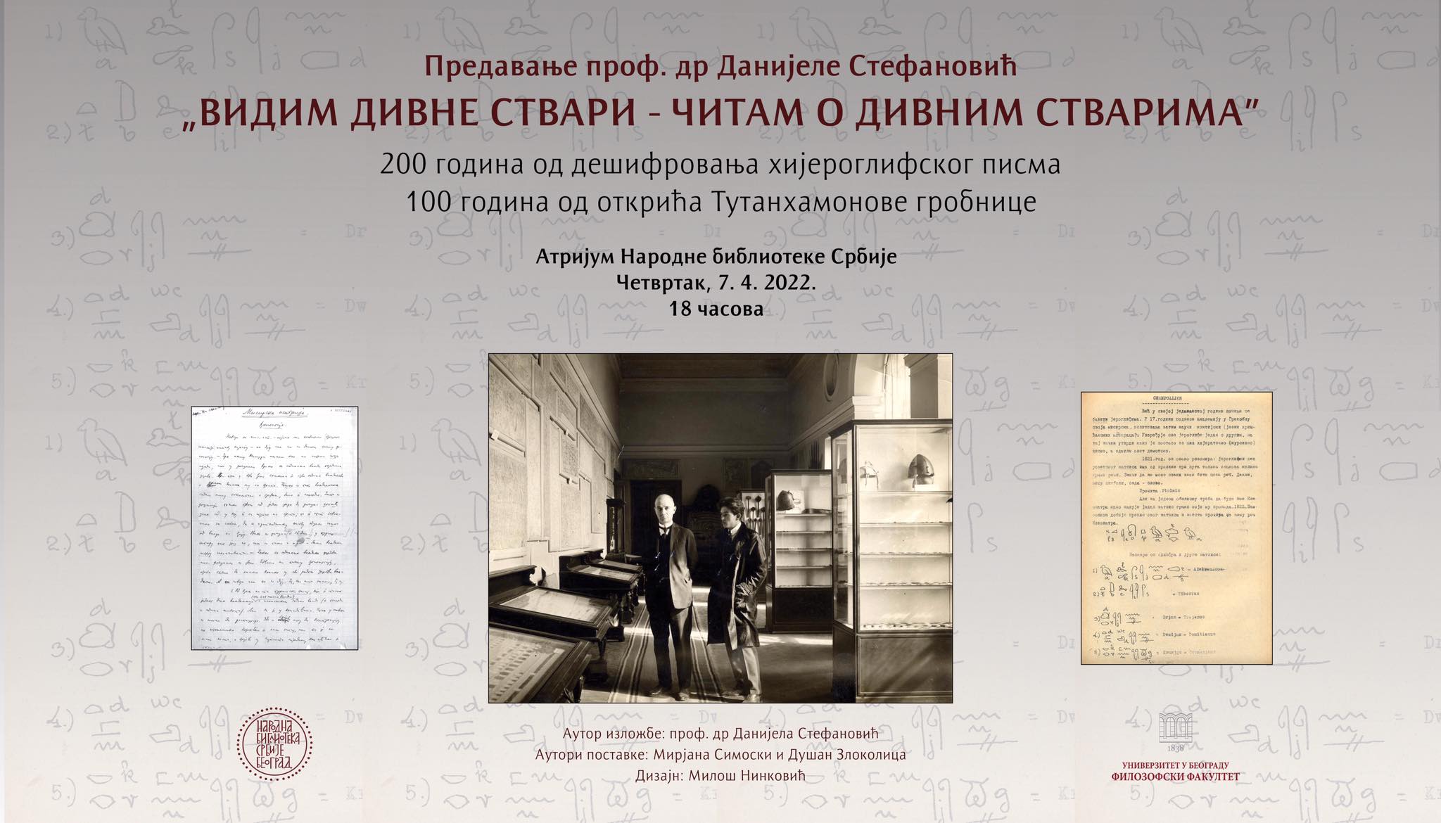 Позивамо вас на предавање које ће одржати проф. др Данијела Стефановић са Одељења за историју Филозофског факултета Универзитета у Београду на тему: „Видим дивне ствари – читам о дивним стварима“ поводом 200 година од дешифровања хијероглифског писма и 100 година од открића Тутанхамонове гробнице.